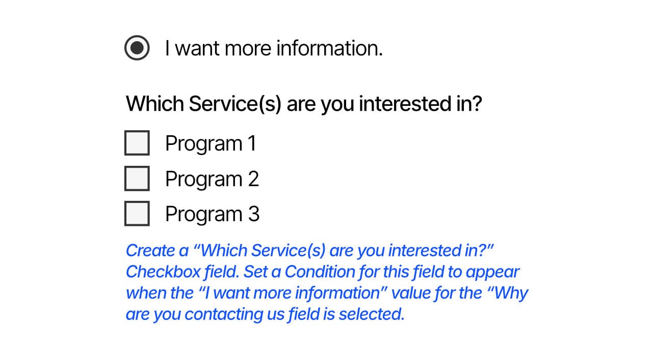 When a user selects the “I want more information” option, we want a “Which Service(s) are you interested in?” Checkbox field to appear (below the “Why are you contacting us?” field).