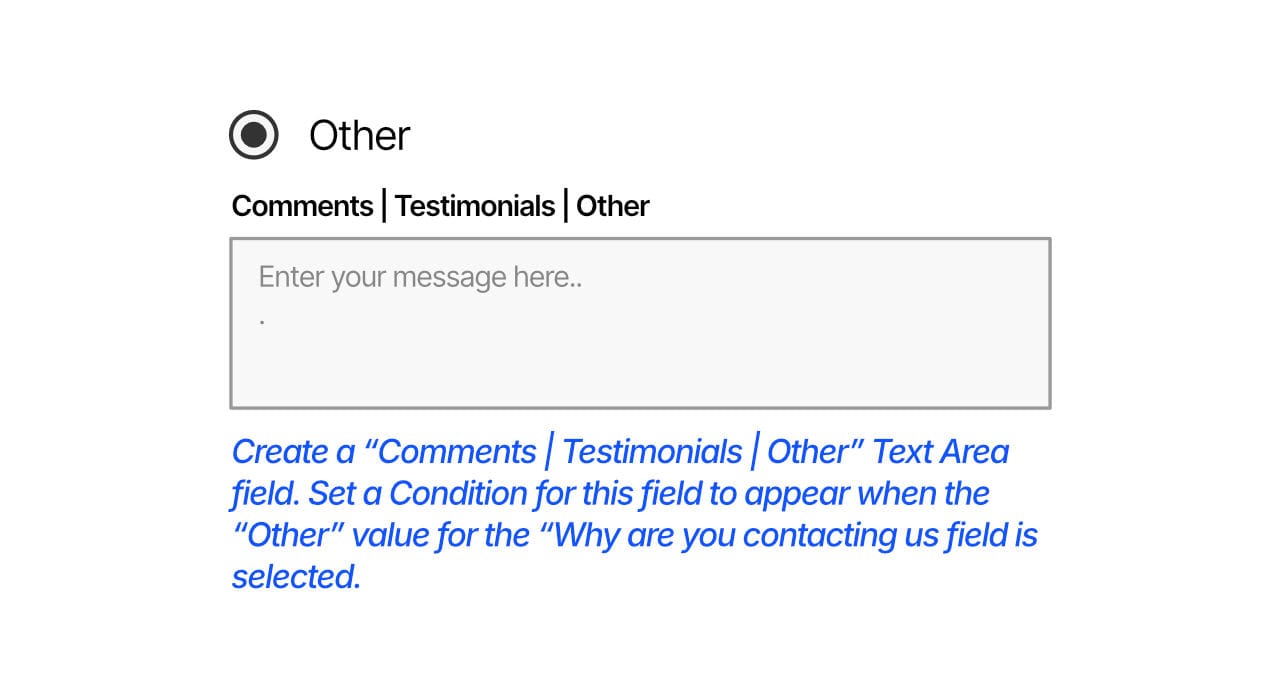 When a user selects the “Other” option, we want a “Comments | Testimonials | Other” Text Area field to appear (below the “Why are you contacting us?” field).