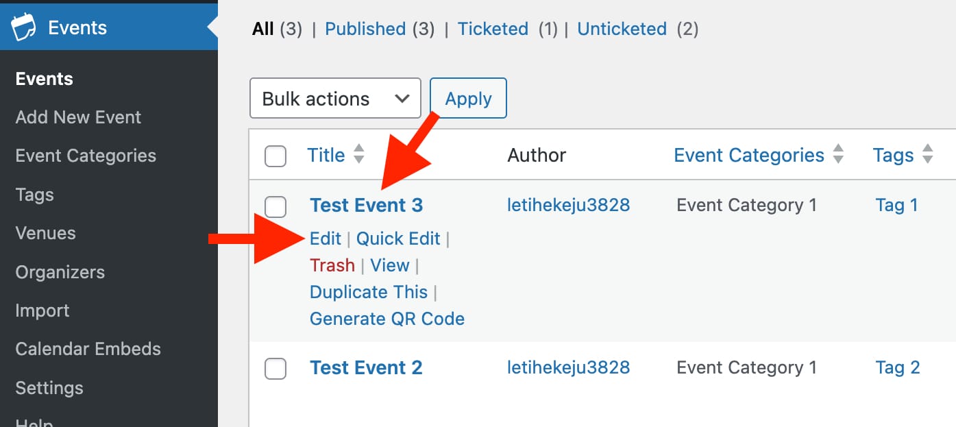 - Click the Title of an event, or click the Edit link.